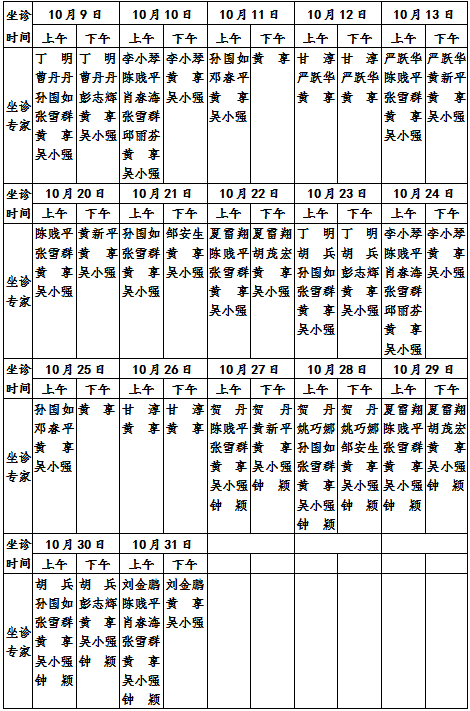 國慶節期間休息;10月14—19日舉辦樟樹第56屆藥交會全國名老中醫大型義診,具體義診信息將通過“樟樹發布”“樟樹市中醫醫院”微信公眾號發布。