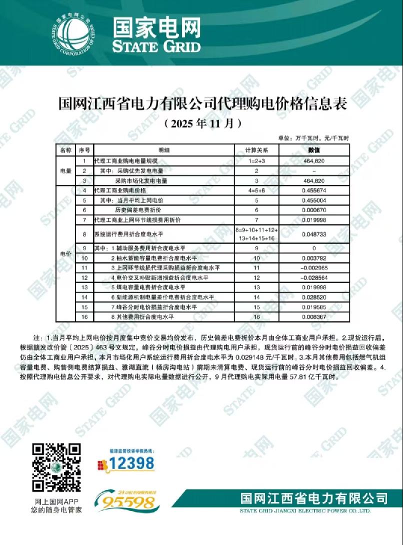 國網江西省電力有限公司代理購電價格信息表(2025年11月)
