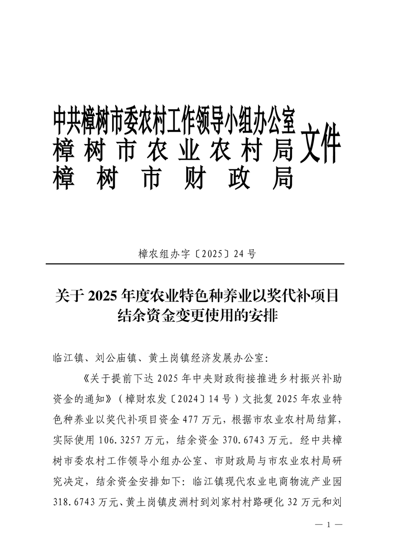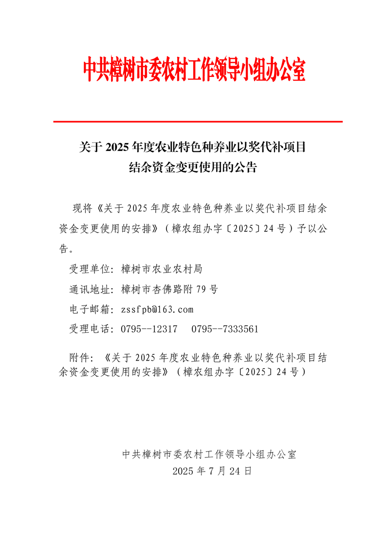 關于2025年度農業色種養業以獎代補項目結余資金變更使用的公告