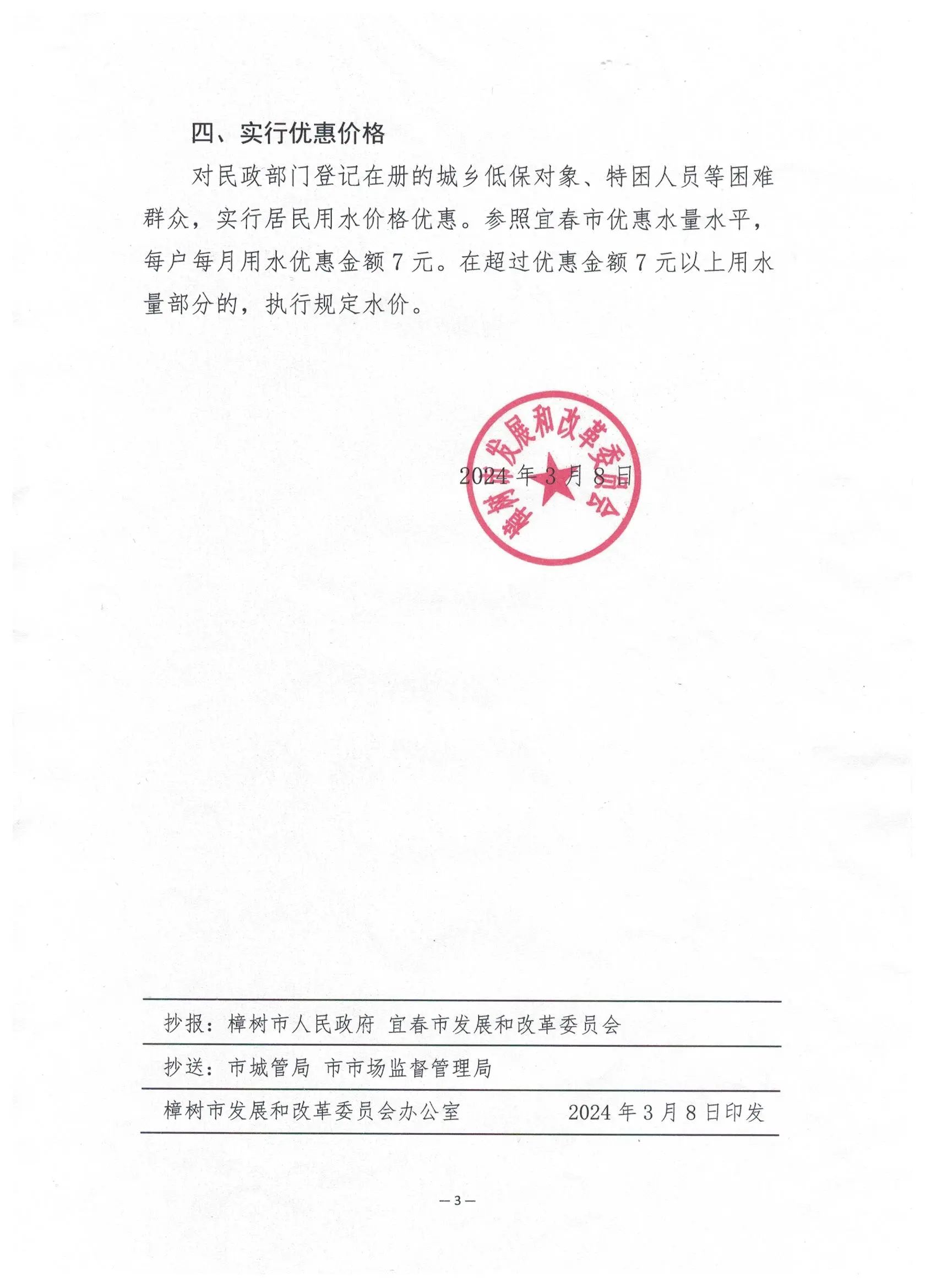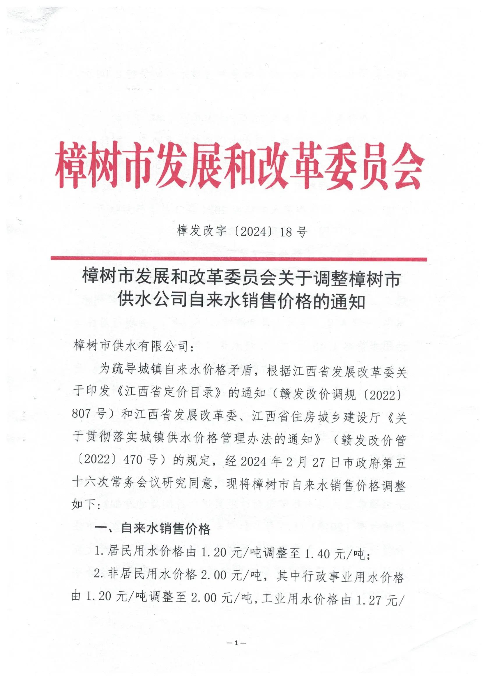 關(guān)于調(diào)整樟樹市供水公司自來水銷售價格的通知