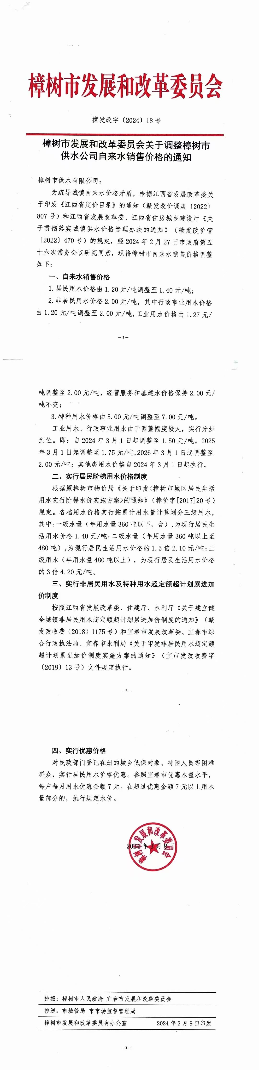 根據江西省發展改革委、江西省住房城鄉建設廳《關于貫徹落實城鎮供水價格管理辦法的通知》(贛發改價管〔2022〕470號)和宜春市發展改革委、宜春市綜合行政執法局《關于貫徹落實城鎮供水價格管理辦法的通知》文件精神。實行城鄉供水一體化的地方,應執行同一供水價格。經市人民政府批復,同意從2025年1月1日起將鹽化基地工業用水價格由0.75元/噸調整為1.50元/噸,今后按照《關于調整樟樹市供水公司自來水銷售價格的通知》(樟發改字〔2024〕18號)分步調整。即:2025年3月1日起調整至1.75元/噸;2026年3月1日起調整至2.00元/噸。原鹽化基地附近村民用水價格由0.75元/噸調整為1.00元/噸,其他今后接入市政供水管網居民用水價格按1.40元/噸執行。