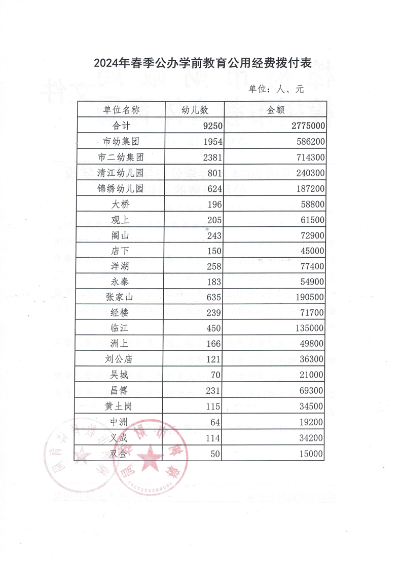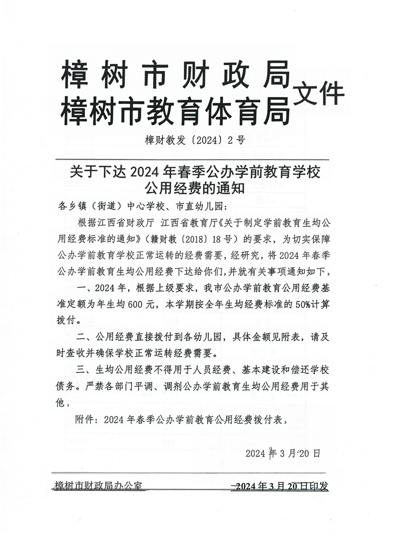 【學前教育】樟財教發[2024]2號關于下達2024年春季公辦學前教育學校公用經費的通知