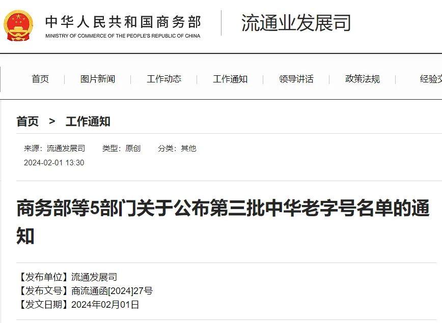 為貫徹黨中央、國務院決策部署,落實中央經濟工作會議精神,推動老字號守正創新發展,根據《中華老字號示范創建管理辦法》,經企業申報、地方推薦、社會公示,商務部、文化和旅游部、市場監管總局、國家知識產權局、國家文物局決定將382個品牌認定為第三批中華老字號,現予公布。