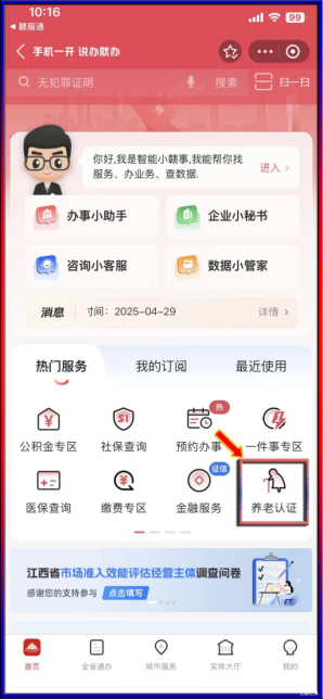 從“贛服通”找到“熱門服務”中的“養老認證”,本人認證選擇“本人辦理資格認證”,幫助親友認證選擇“代他人辦理資格認證”。