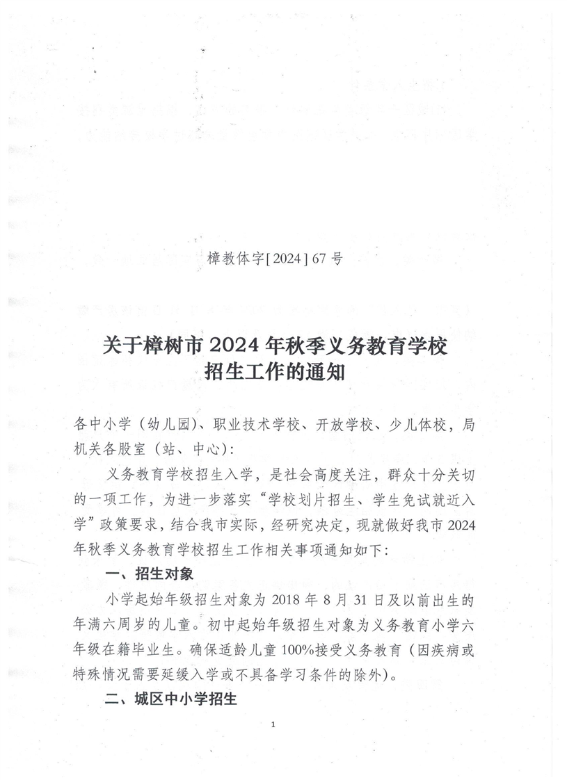 【義務教育】樟教體字〔2024〕67號關于樟樹市2024年秋季義務教育學校招生工作的通知(含招生政策及分區劃片)