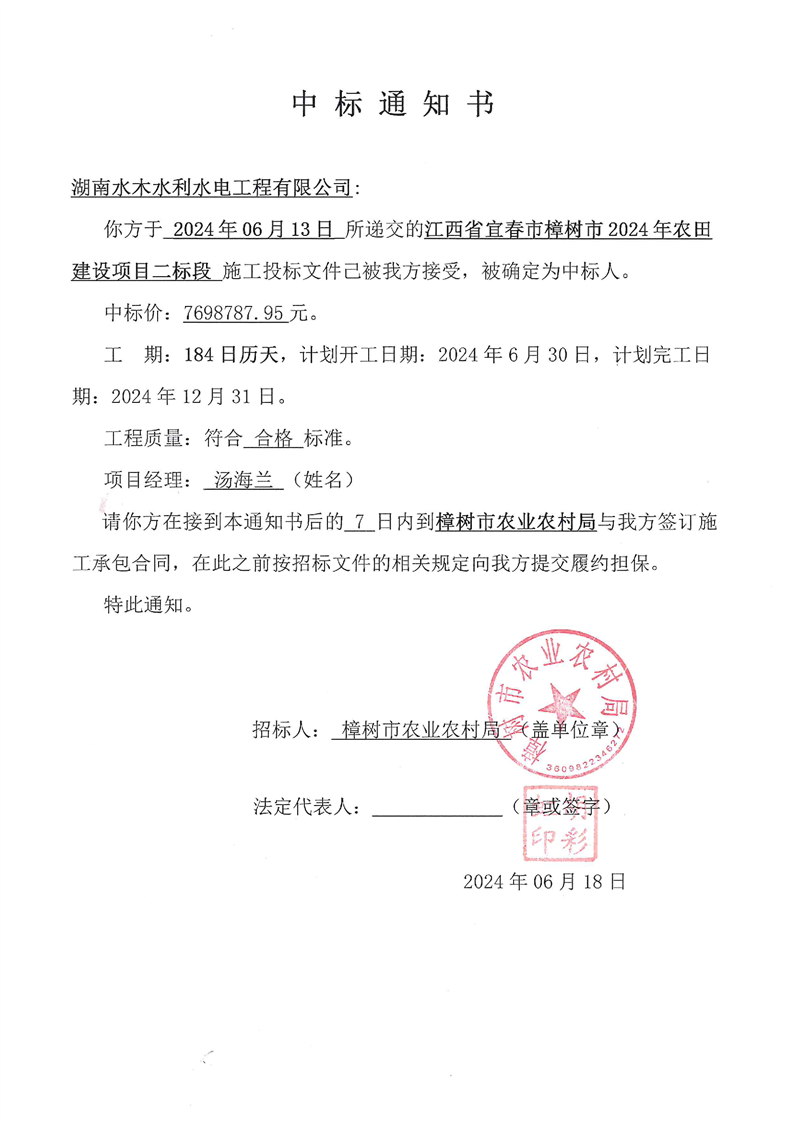 江西省宜春市樟樹市2024年建設項目二標段中標通知書