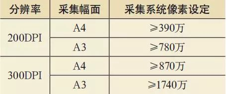 當A4幅面清晰度要求達到200DPI時,采集系統像素設定應不小于390萬像素,達到300DPI時,采集系統像素設定應不小于870萬像素;A3幅面清晰度要求達到200DPI時,采集系統像素設定應不小于780萬像素,達到300DPI時,采集系統像素設定應不小于1740萬像素。