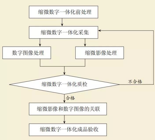1.縮微數字一體化加工基本流程紙質檔案縮微數字一體化加工基本環節包括:縮微數字一體化前處理、縮微數字一體化采集、數字圖像處理和縮微影像處理、縮微影像和數字圖像的關聯、縮微數字一體化成品驗收(如圖1所示)。