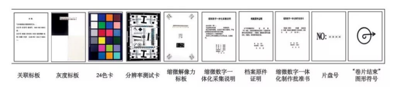前標識區標板包括:“卷片開始”圖形符號、片盤號、縮微數字一體化制作批準書、檔案原件證明、縮微數字一體化采集說明、縮微解像力標板、分辨率測試卡、24色卡、灰度標板、關聯標板(如圖2所示)。
