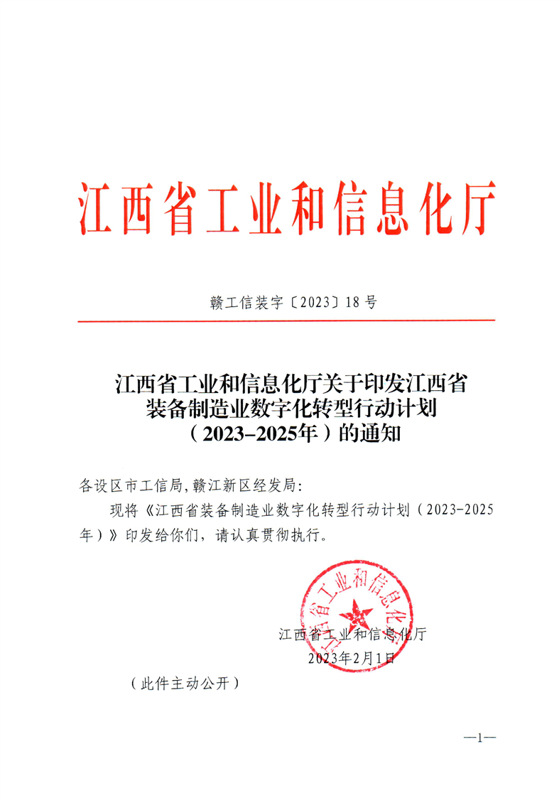 贛工信裝字〔2023〕18號 江西省工業和信息化廳關于印發江西省裝備制造業數字化轉型行動計劃(2023-2025年)的通知