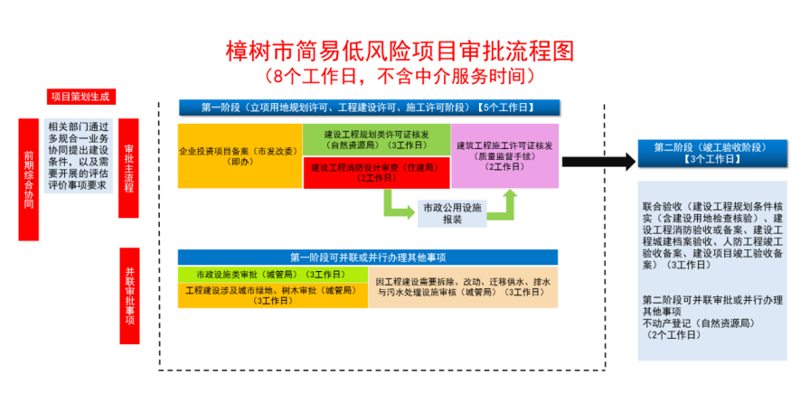 簡易低風(fēng)險工程建設(shè)項目審批分為兩個階段,第一階段為立項用地許可、工程建設(shè)許可、施工許可階段。該階段可并聯(lián)涉及需開展的市政公用設(shè)施接入報裝(含供水、排水、電、氣、弱電等)、市政設(shè)施建設(shè)類審批(含占用、挖掘城市道路審批等)、建筑垃圾處置核準(zhǔn)以及因工程建設(shè)需要拆除、改動、遷移供水、供電、排水、弱電等實施審核申請合并進(jìn)行,同步辦理。前期階段企業(yè)投資項目備案獲取項目代碼不計時,建設(shè)工程規(guī)劃類許可核發(fā)(含《建設(shè)項目用地批準(zhǔn)書》和《建設(shè)工程規(guī)劃許可證》)辦理時限不超過3個工作日。施工許可(含《建筑工程施工許可證》、質(zhì)量監(jiān)督手續(xù)、安全施工措施備案登記等)辦理時限不超過2個工作日。第二階段為竣工驗收階段,該階段聯(lián)合驗收,并聯(lián)了工程規(guī)劃類規(guī)劃條件核實、消防備案、城建檔案、工程竣工驗收備案等事項,建設(shè)單位需要辦理不動產(chǎn)登記的,將其納入聯(lián)合驗收范圍,辦理時限不超過3個工作日。