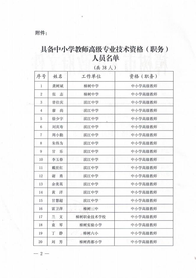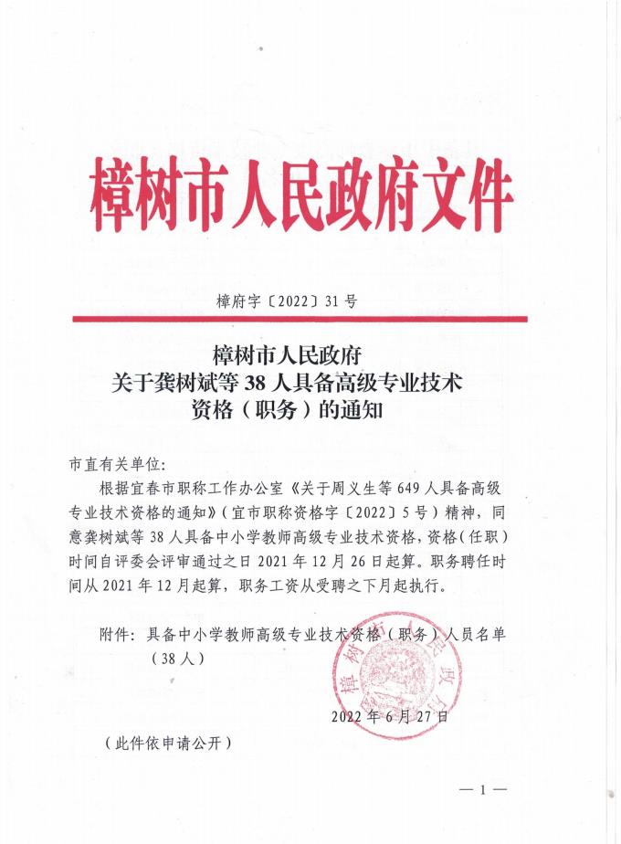 樟府字〔2022〕31號(hào)關(guān)于龔樹(shù)斌等38人具備高級(jí)專(zhuān)業(yè)技術(shù)資格(職務(wù))的通知