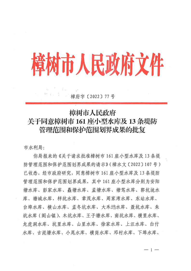 樟府字〔2022〕77號 關于同意樟樹市161座小型水庫及13條堤防管理范圍和保護范圍劃界成果的批復