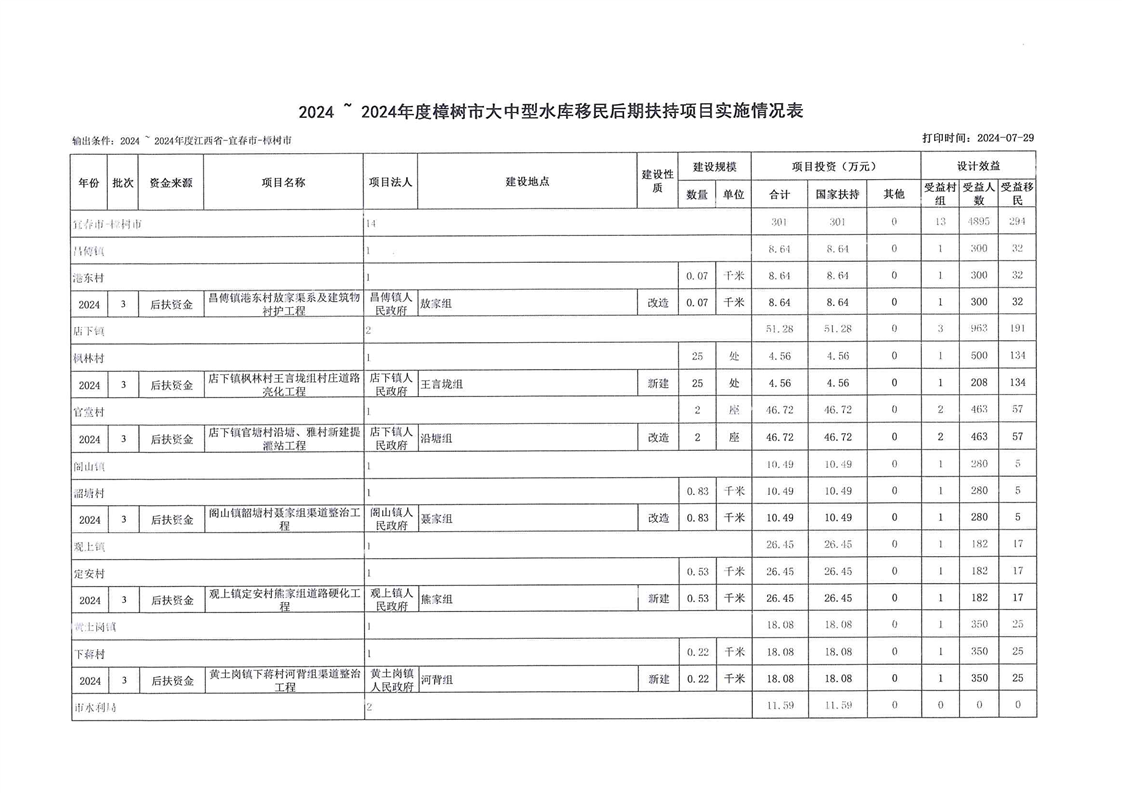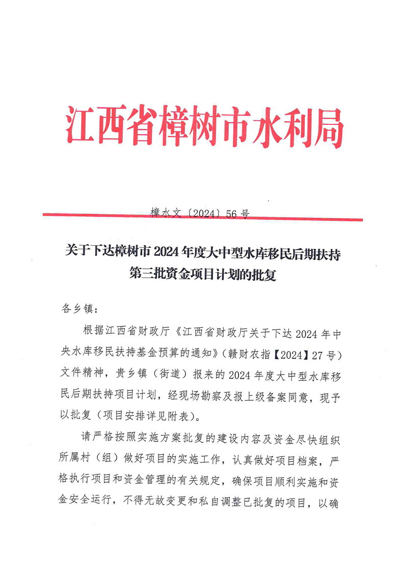 關(guān)于下達(dá)樟樹市2024年度大中型水庫移民后期扶持第三批資金項(xiàng)目計(jì)劃的批復(fù)