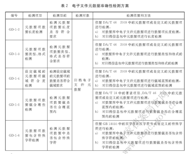 檢測歸檔電子文件元數(shù)據(jù)是否符合DA/T 46一2009 等標準或自定義元數(shù)據(jù)方案要求,包括數(shù)據(jù)長度、類型、格式、值域以及元數(shù)據(jù)項賦值是否合理等。