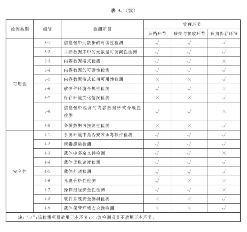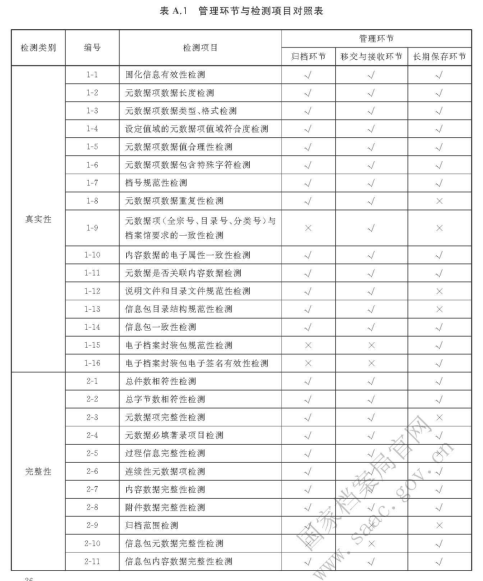 檢測項目總計45項,包括真實性、完整性、可用性、安全性四個類別,其中真實性檢測項目16項,完整性檢測項目11項,可用性檢測項目9項,安全性檢測項目9項,覆蓋電子文件歸檔環(huán)節(jié)電子檔案移交與接收環(huán)節(jié)和電子檔案長期保存環(huán)節(jié)。管理環(huán)節(jié)與檢測項目的對照表參見附錄A。