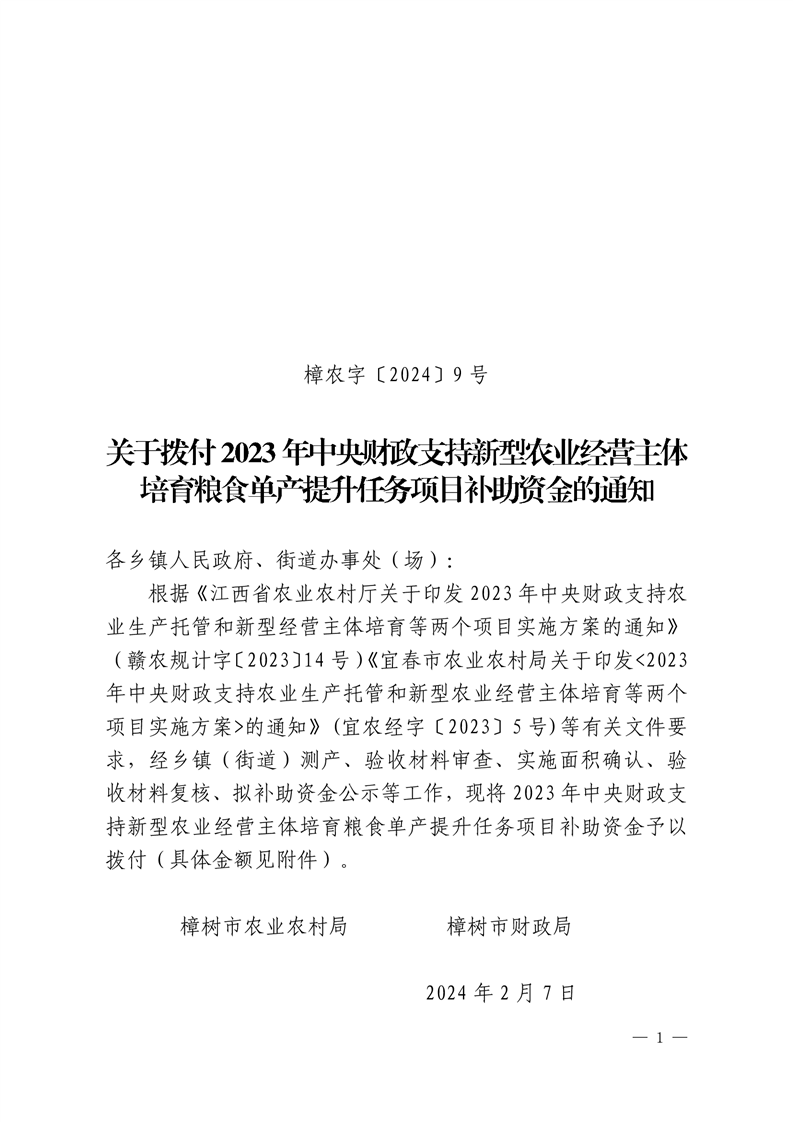 樟農(nóng)字〔2024〕9號(hào)關(guān)于撥付2023年中央財(cái)政支持新型農(nóng)業(yè)經(jīng)營(yíng)主體培育糧食單產(chǎn)提升任務(wù)項(xiàng)目補(bǔ)助資金的通知