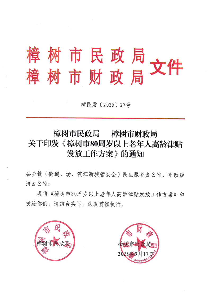 【轉(zhuǎn)載】 關(guān)于印發(fā)《樟樹市80歲以上老年人高齡津貼發(fā)放工作方案》的通知