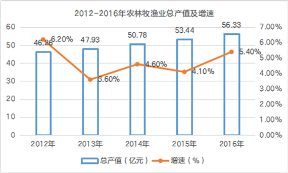 全年農(nóng)林牧漁業(yè)完成總產(chǎn)值56.33億元,增長(zhǎng)5.4%。其中,農(nóng)業(yè)產(chǎn)值26.87億元,增長(zhǎng)6.5%;林業(yè)產(chǎn)值2.15億元,增長(zhǎng)9.3%;牧業(yè)產(chǎn)值19.17億元,增長(zhǎng)2%;漁業(yè)產(chǎn)值7.5億元,增長(zhǎng)3.2%。