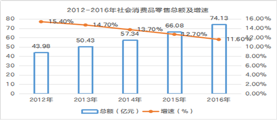 全年社會(huì)消費(fèi)品零售總額74.13億元,比上年增長(zhǎng)11.6%。其中,限額以上消費(fèi)品零售總額13.1億元,增長(zhǎng)19.1%。