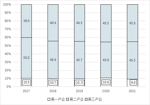 圖 2 2017—2021年三次產(chǎn)業(yè)增加值占生產(chǎn)總值比重