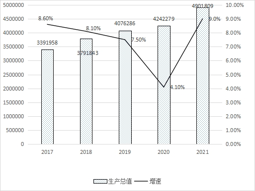 圖 1 2017—2021年生產(chǎn)總值及其增長(zhǎng)速度