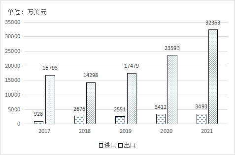 全年貨物貿(mào)易進(jìn)出口總值35856萬(wàn)美元,比上年增長(zhǎng)32.8%。其中,出口值32363萬(wàn)美元,增長(zhǎng)37.2%;進(jìn)口值3493萬(wàn)美元,增長(zhǎng)2.4%。