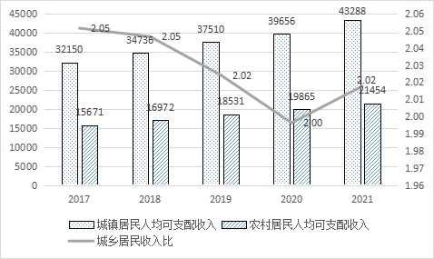 圖 9 2017-2021年城鎮(zhèn)、農(nóng)村居民可支配收入及城鄉(xiāng)居民收入比