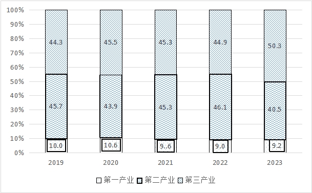 圖 2 2019—2023年三次產業增加值占生產總值比重