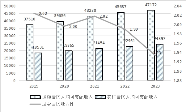 圖 9 2019-2023年城鎮、農村居民可支配收入及城鄉居民收入比