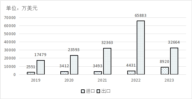 全年貨物貿易進出口總值41584萬美元,比上年下降35.7%。其中,出口值32664萬美元,下降45.8%;進口值8920萬美元,增長101.3%。