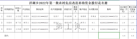 洋湖鄉(xiāng)第一批農(nóng)村危房改造補(bǔ)助資金花名冊(cè)