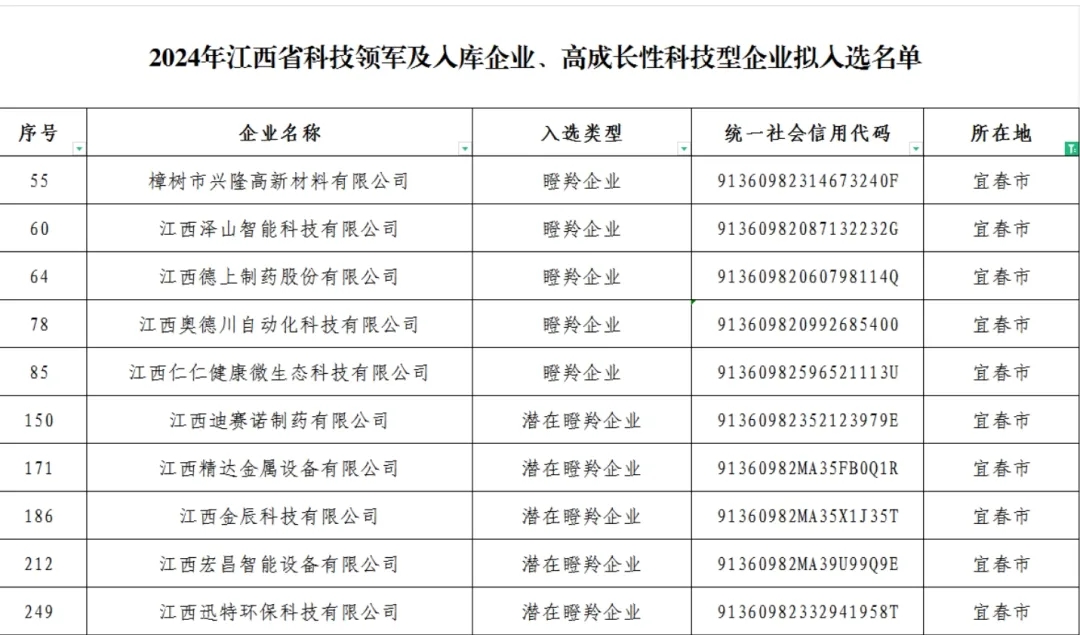 日前,江西省科學(xué)技術(shù)廳發(fā)布2024年江西省科技領(lǐng)軍及入庫(kù)企業(yè)、高成長(zhǎng)性科技型企業(yè)名單公示,我市入庫(kù)高成長(zhǎng)性科技型企業(yè)共10家,其中瞪羚企業(yè)5家,潛在瞪羚企業(yè)5家,數(shù)量居宜春市第一。